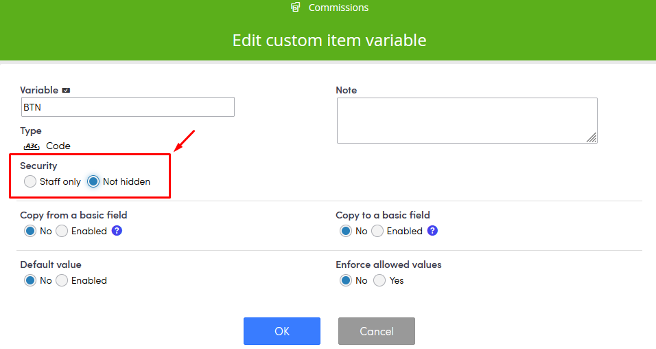 For example information such as BTN, Install Date, or Order ID can be changed to allow the passing of information to the Reps to see. Clicking the Pencil icon and then changing the Security option to Not hidden will show this information when your Reps download their commission data.
