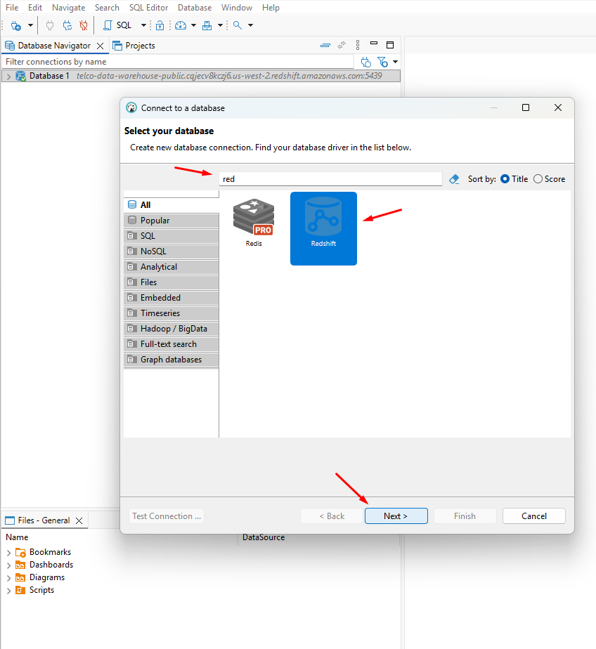 Ensure that you the search criteria in the left pane is set to All. Search for Redshift >> click icon >> Next.